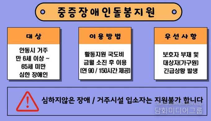 중증장애인돌봄 및 가족휴식지원사업은 도전적인 행동이나 장애가 있는 중중장애인가족을 돌보느라 힘든 시간을 보내고 있는 장애인가족들의 어려운 현실에 공감하여, 장애인가족들에게 실질적인 편의와 휴식을 지원하기 위한 권기창 안동시장의 공약 사업이다. 이용을 원하는 안동시 거주 장애인가족들의 많은 참여를 바란다.