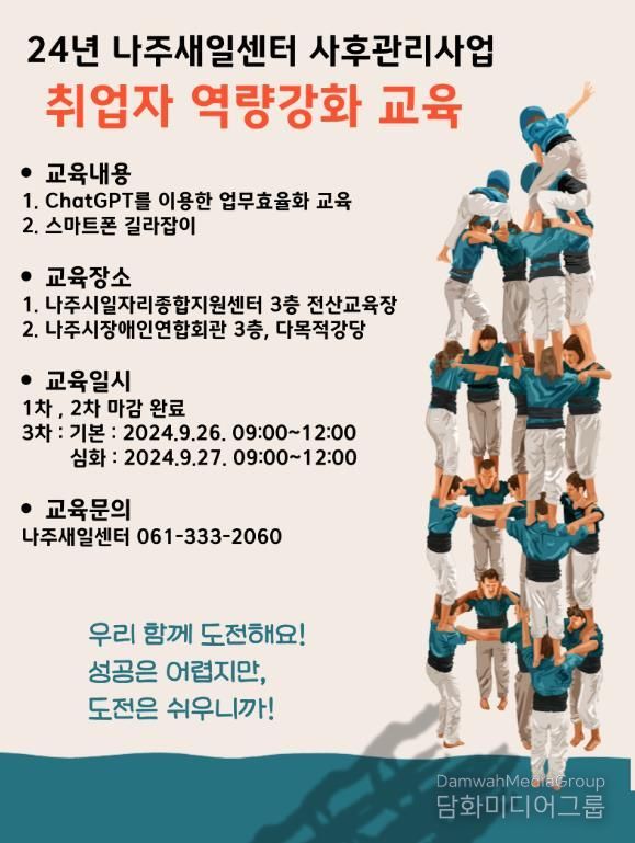 시민행정신문 강갑수 기자 | 전라남도 나주시는 나주새일센터에서 구직자와 재직자들의 경쟁력 강화를 위한 ‘ChatGPT를 이용한 업무 효율화 교육’과 ‘누구나 쉽게 배우는 스마트폰 길라잡이 교육’을 새롭게 진행한다고 23일 밝혔다.