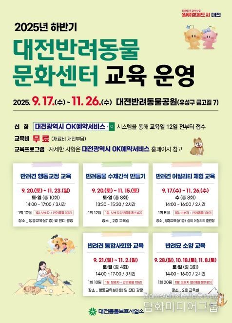시민행정신문 강갑수 기자 | 대전광역시 동물보호사업소는 시민들의 반려동물 이해를 높이고 사람과 반려동물이 조화롭게 공존할 수 있는 환경을 조성하기 위해 '2025 하반기 반려동물 교육프로그램'을 9월 17일부터 11월 26일까지 총 33회 운영한다고 밝혔다.