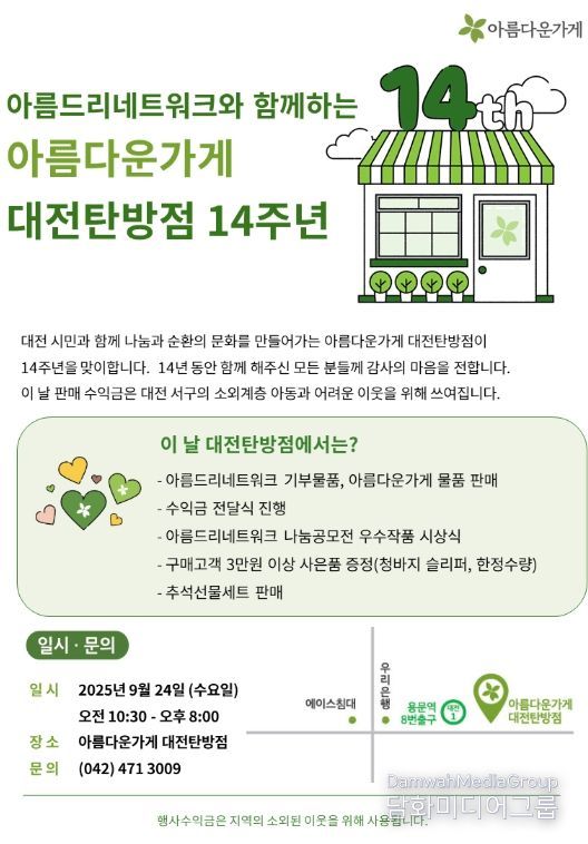 시민행정신문 강갑수 기자 | 대전 서구 괴정동 행정복지센터는 아름드리교육복지네트워크, 용문종합사회복지관, 한민시장상인회, 아름다운가게 탄방점 등과 함께 오는 24일 ‘2025 아름다운 하루’ 행사를 개최한다고 10일 전했다.