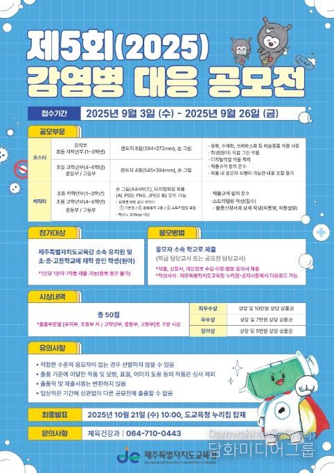 시민행정신문 기자 | 제주특별자치도교육청은 오는 26일까지 학생들이 안전하고 건강한 학교와 사회를 만들 방법을 스스로 생각하고 실천할 수 있는 기회를 제공하기 위해 ‘제5회 감염병 대응 공모전’을 개최한다.
