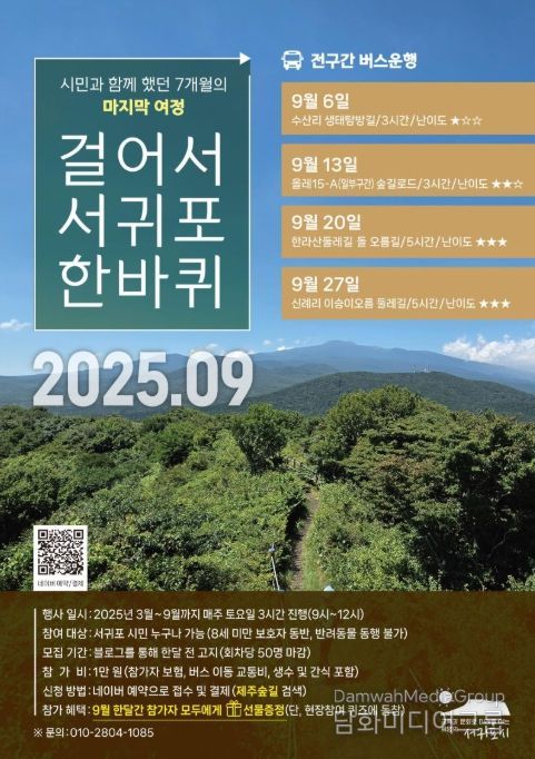 시민행정신문 강갑수 기자 | 서귀포시는 건강한 걷기문화 확산과 시민 건강증진을 위해 운영 중인 ‘걸어서 서귀포 한바퀴’ 프로그램이 오는 9월 27일 마지막 일정을 앞두고, 누적 1,000여 명이 참여하며 큰 호응을 얻고 있다고 밝혔다.