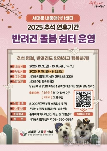 이성헌 구청장은 “구민분들께서 반려견 걱정 없이 편안하게 명절 연휴를 보내실 수 있도록 이 서비스를 마련했으며 앞으로도 반려동물과 사람이 함께 행복한 서대문구를 위해 다양한 지원사업을 이어가겠다”고 말했다.