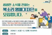 시민행정신문 강갑수 기자 | 광주광역시 북구는 구정 소식지인 ‘북소리’를 통해 지역의 생생한 소식을 전달하는 명예기자단을 모집한다고 14일 밝혔다. ‘북소리 명예기자단’은 구정 홍보에 주민들의 참여를 활성화하기 위해 지난 2009년 발족한 이후 현재까지 운영되고 있다. 이번 모집에서는 제9기 명예기자단 40여 명을 선발할 계획이다. 지역사회에 관심이 많고 기사 작성 및 인터넷 활용 능력을 갖춘 북구 주민이라면 누구나 신청할 수 있다. 모집 기간은 다음 달 12일까지이며 신청 방법은 지원서와 자유 주제 기사 1개를 작성해 이메일로 제출하면 된다. 지원자들이 제출한 서류를 바탕으로 맞춤법, 문장 표현력, 구정 이해도 및 관심도 등의 기준에 따라 심사한 뒤 2월 말 최종 합격자를 확정될 계획이다. 선발된 명예기자는 오는 3월부터 2년간 활동하며 주민들의 시선에서 지역 소식과 미담 사례 등을 취재해 ‘북소리’에 연 1회 이상 기사를 게재한다. 북구는 명예기자단의 원활한 활동을 위해 편집회의, 워크숍, 교육 등을 지원하고 원고가 채택될 경우 소정의 원고료를 지급할 계획이