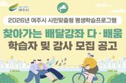 시민행정신문 강갑수 기자 | 여주시는 시민 누구나 원하는 시간과 장소에서 배움을 이어갈 수 있도록 지원하는 2026년 시민 맞춤형 평생학습 프로그램 ‘찾아가는 배달강좌’의 학습자와 강사를 모집한다고 밝혔다. ‘찾아가는 배달강좌’는 여주시민 또는 관내 사업체 근로자 7명 이상이 학습모임을 구성해 강좌를 신청하면, 전문 강사가 직접 찾아가 강의를 진행하는 학습자 중심의 평생학습 프로그램으로 이 사업은 평생학습 접근성을 높이고, 학습 사각지대 해소와 공동체 기반 학습문화 확산에 기여하고 있다. 학습자 ‘다·배움’모집은 2026년 2월과 5월(각 1~10일) 진행되며, 선정된 학습모임은 강좌당 최대 20시간 이내에서 무료로 교육을 받을 수 있으며, 강사 ‘다·선생’모집은 1월과 4월(각 20~25일) 두 차례 진행되며, 선정된 강사는 학습모임과 매칭돼 강의를 진행한다. 특히, 2026년부터는 기존 일반강좌 외에도 정책 연계형 특화강좌가 새롭게 운영되어 ▲경력단절 여성의 사회 재도약 ▲생활밀착형 생성형 AI 활용 교육 ▲농업·생태·전통문화 융합형 미래인재 양성 등 시민의 생애주기와 지역 특성을 반영한 맞춤형 학습으로,