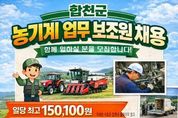 시민행정신문 강갑수 기자 | 합천군은 농기계대여은행 운영체계를 강화하고 농업인 영농 편의를 높이기 위해 2026년 농기계 업무보조원 기간제근로자 9명을 채용한다고 14일 밝혔다. 이번 채용은 기간제근로자의 처우 개선을 통해 안정적인 일자리를 제공하고, 이를 바탕으로 농기계대여은행 이용 농업인들의 영농 편의를 실질적으로 향상시키기 위한 정책의 일환으로 추진된다. 채용 인원은 9명(기술직 8명, 민원응대 1명)이며, 선발된 인원은 농기계대여은행에서 농기계 입·출고 관리, 배송 지원, 임대장비 유지·관리 및 기초 점검, 농기계 순회 안전(수리)교육 지원, 농업인 민원 응대 등 현장 밀착형 업무를 수행하게 된다. 특히 합천군은 업무 숙련도와 전문성을 보수에 반영하는 기술등급별 임금체계를 적용해(99,910원/일~150,100원/일, 복리후생 수당 30만원/월), 농기계 정비수리 실기평가 결과에 따라 차등 지급함으로써 능력과 책임에 상응하는 합리적인 보상체계를 마련했다. 이를 통해 근로자의 근무 안정성과 책임성을 높이고, 서비스 품질 향상으로 이어지는 선순환 구조를 만든다는 방침이다. 채용 대상자는 농기