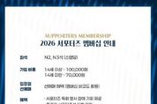 시민행정신문 장규호 기자 | 김천상무 공식 서포터즈 ‘수사불패’가 멤버십 회원을 모집한다. 김천상무 공식 서포터즈 수사불패가 1월 28일부터 시즌 종료 시까지 ‘2026 서포터즈 멤버십’ 회원을 모집한다. 멤버십은 선착순 200명 한정으로 운영되며, 가입비는 14세 이상 10만 원, 14세 미만 7만 원이다. 이번 서포터즈 멤버십은 ‘역대급 혜택’으로 구성됐다. 먼저 멤버십 회원은 김천상무 홈경기 시 선수들과 가장 가까운 곳에서 응원의 열기를 느낄 수 있는 서포터즈석(N2, N3구역) 입장권을 정액 7천 원에 구매할 수 있다. 동시에 가입회원 본인에 한해 서포터즈석 선예매가 가능하다. 다양한 이벤트 혜택도 있다. 서포터즈 특화 행사 참여 기회가 제공되며, 홈경기 서포터즈석 티켓 지원, 원정경기 티켓 일부 지원 혜택도 받을 수 있다. 멤버십 패키지 구성 또한 풍성하다. 서포터즈를 형상화한 멤버십 실물카드와 랜야드가 기본으로 제공되며, 14세 이상 가입자는 구단 공식 의류 후원사 켈미 바람막이를 받을 수 있다. 14세 미만 가입