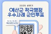 시민행정신문 강갑수 기자 | 예산군은 2025년 상반기 적극행정 우수공무원 선발을 위해 오는 11일부터 17일까지 7일간 온라인 군민투표를 실시한다고 밝혔다. 군은 적극적인 업무 추진으로 공공의 이익 증진에 기여하고 공직사회 내 적극행정 문화 확산을 위해 매년 상·하반기 적극행정 우수공무원을 선발하고 있다. 군민투표는 1차 내부 실무평가단 심사를 통과한 적극행정 사례 5건을 대상으로 진행되며, 정보무늬(QR코드) 접속 또는 군 누리집 ‘군민참여→설문조사’ 코너에서 본인 인증 후 참여할 수 있다. 군은 실무심사 점수와 적극행정위원회 심사 점수를 합산해 11월 중 우수공무원을 최종 선발할 계획이며, 특히 이번 선발부터는 인사상 우대 조치와 함께 포상금도 지급된다. 예산군수는 “군민의 목소리를 직접 듣고 적극행정 활성화를 도모할 수 있도록 이번 군민투표에 많은 관심과 참여를 바란다”고 당부했다.