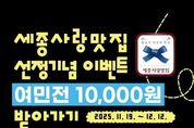 시민행정신문 강갑수 기자 | 세종시문화관광재단은 지역의 우수 음식점을 선정한 ‘2025년 세종사랑맛집’ 44곳 발표를 기념해 시민들의 방문을 독려하고 방문 리뷰 활성화를 위한 특별 이벤트를 진행한다고 밝혔다. 이번 이벤트는 소비자들이 식당 선택 시 가장 중요하게 고려하는 요소인 ‘방문 리뷰’를 확대함으로써, 지역 소상공인의 홍보 효과를 높이고 실질적인 매출 증대에 기여하고자 마련됐다. 재단은 선정된 세종사랑맛집을 방문한 뒤 후기를 남긴 참여자 선착순 1,000명에게 1인당 1만 원 상당의 지역화폐(여민전) 을 지급할 예정이다. 이벤트 기간은 12월 12일까지이며, 음식점뿐 아니라 카페·베이커리 등 다양한 업종이 포함돼 세종의 폭넓은 미식을 경험할 수 있다. 김지훈 관광사업팀장은 “시민이 추천하고 전문가가 인증한 세종사랑맛집을 직접 방문해 진짜 세종의 맛을 느껴보시길 바란다”며 “많은 시민들의 관심과 참여를 부탁드린다”고 말했다. 세종사랑맛집 44곳 목록과 이벤트 참여 방법은 ‘세종미식여행’ 누리집에서 확인할 수 있다.
