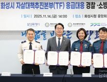 시민행정신문 강갑수 기자 | 화성특례시는 지난 11월 14일 오후 2시, 화성시청 중앙회의실에서 ‘자살대책추진본부(TF) 응급대응을 위한 경찰·소방 업무협약’을 체결했다고 밝혔다. 이번 협약은 자살위기 상황 발생 시 신속하고 체계적인 대응으로 자살 고위험군을 조기에 발굴하고, 이들에게 통합적 서비스를 제공하기 위한 목적이다. 협약식에는 정명근 화성특례시장을 비롯해 이재홍 서부경찰서장, 강은미 동탄경찰서장, 장재구 화성소방서장이 참석했다. 4개 기관은 ▲자살 고위험군 발굴 및 위기 대응 ▲지역 특성을 반영한 위기 전달체계 확립 ▲합동 출동을 통한 대응체계 구축 등에 협력하기로 뜻을 모았다. 정명근 화성특례시장은 “자살 문제는 단순한 연락이나 일시적 개입으로 해결될 수 없다”며 “위기 발견부터 생활 개선까지 이어지는 통합 대응체계를 통해 시민의 생명을 지키는 데 최선을 다하겠다”고 말했다. 한편, 화성특례시는 지역 주민의 정신건강 증진과 생명존중문화 확산을 위해 맞춤형 자살예방 프로그램과 체계적인 지원 시스템을 지속적으로 구축해왔다. 특히 ‘화성특례시 자살예방 핫라인’을 운영해