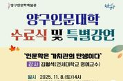 시민행정신문 기자 | 양구군은 8일 양구인문학박물관 세미나실에서 인문대학 수료식 및 특별강연을 진행한다. 양구 인문대학은 올해 4월부터 11월까지 매월 1회 ‘조화와 균형의 인문학’을 주제로 운영됐다. 인문학 전문 강의를 통해 군민의 인문학적 소양을 함양하고, 양구군을 인문학 중심도시로 육성하기 위한 기반을 마련하고자 추진됐다. 올해 인문대학에는 총 53명이 접수해 이 중 25명이 수료한다. 수료식에서는 전체 강의의 80% 이상을 이수한 수강생에게 양구군수와 김형석 명예교수 명의의 수료증이 수여된다 수료식 이후에는 김형석 명예교수가 ‘인문학은 가치관의 탄생이다’를 주제로 특별강연을 진행한다. 강연에서는 급변하는 현대사회 속에서 개인의 사유, 가치 판단, 삶의 태도 형성에 있어 인문학이 갖는 의미를 되짚어볼 예정이다. 진행된 강좌 △고미술과 현대미술의 균형적 이해 △소통을 위한 공감 독서법 △진심을 담은 옛 사람들의 소통법 △기계와 짐승 사이에서 △덜 소비하고 더 나누는 삶 △어머니의 밥상을 찾아서: ‘귀향’ 등에서 다양한 인문학적 관점을 다뤄 수강생들의 높은 호응을 받았다. 임경빈 인