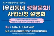시민행정신문 강갑수 기자 | 대구문화예술진흥원은 2월 13일부터 3월 6일까지 2026 생활문화육성지원사업 '우리동네 생활문화'에 참여할 생활문화 공간 및 연계 기획단체를 공개 모집한다. ‘우리동네 생활문화’는 지역 내 새로운 생활문화 공간을 발굴하고, 생활문화 기획 프로그램 운영을 통해 커뮤니티 기반 생활문화 공간 조성을 지원하는 사업이다. 올해는 대구 전 지역을 대상으로 신규 생활문화 공간 발굴과 함께 생활문화 활동이 부족한 권역(계층·지역)의 활성화 및 지속 가능한 공동체 육성에 중점을 두고 운영된다. 공모 대상은 대구에 소재한 생활문화 활동이 가능한 공간과 생활문화 기획 역량을 갖춘 단체(문화콘텐츠 관련 예술가·기획자·활동가 등으로 구성된 단체)가 연계된 단체가 대상이다. 올해는 총 10개 내외의 단체를 선정할 예정이며 선정된 단체에는 단체당 550만 원의 사업비 지원과 함께 ‘우리동네 생활문화 지도’ 플랫폼 내 통합 홍보 등을 지원할 예정이다. 공모에 앞서 2월 11일 14시, 대구생활문화센터에서 사업설명회가 진행되며, 사업 신청은 2월 13일부터 3월 6일까지 국가문화예술지