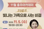 시민행정신문 강갑수 기자 | 충주시는 오는 11월 5일 오후 7시 충주시청 3층 대회의실에서 숭실사이버대학교 이호선 교수를 초청해 ‘21세기 빛나는 가족으로 사는 비결’을 주제로 충주아카데미를 개최한다. 이호선 교수는 숭실사이버대학교 기독교상담복지학과 교수이자, 가족상담 및 노년심리 분야의 권위자로 잘 알려져 있다. KBS '아침마당', MBC '기분좋은 날', JTBC '이혼숙려캠프:새로고침' 등 주요 방송 프로그램에서 인간관계와 가족문제에 관한 따뜻하고 현실감 있는 조언을 전달하며 국민 심리 멘토로 자리매김한 바 있다. 또한, 「마흔의 기술」, 「이호선의 나이 들수록」 등 다수의 저서를 통해 현대사회에서 관계의 회복과 행복한 소통의 중요성을 꾸준히 전하고 있다. 이날 특강에서는 급변하는 사회 속에서 가족 간의 관계를 건강하게 유지하고, 세대 간의 공감과 존중을 회복하는 방법을 유쾌하면서도 깊이 있게 다룰 예정이다. 시 관계자는 “이호선 교수의 강연은 시민들이 가족의 의미를 다시 돌아보고, 일상 속에서 행복을 실천할 수 있는 계기가 될 것”이라며, “많은 시민들의 관심과 참여를 바란다