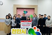 시민행정신문 강갑수 기자 | (재)천안시복지재단은 22일 NH농협은행 남천안지점이 100만 원 상당의 건강식품을 후원했다고 밝혔다. NH농협은행 남천안지점은 지난 2016년부터 정기후원에 참여하며 지역사회 나눔 문화 확산에 기여하고 있다. 또 매년 저소득층의 생애주기별 맞춤형 사회공헌활동을 이어오며 재단의 든든한 동반자 역할을 하고 있다. 이동현 지점장은 “지난해 학교 밖 청소년 지원에 이어 올해는 저소득 어르신들의 건강증진을 돕기 위해 후원에 동참했다”며 “임직원 모두가 뜻을 모아 기업의 사회적 가치인 상생을 실천할 수 있어 뜻깊게 생각한다”고 말했다. 이운형 천안시복지재단 이사장은 “크리스마스를 앞두고 따뜻한 나눔을 실천해주신 NH농협은행 남천안지점에 감사드린다”며 “후원자와 함께 나눔의 가치를 확산하는 데 최선을 다할 것”이라고 말했다. 한편 NH농협은행 남천안지점은 천안시 나눔 문화 확산에 기여한 공로를 인정받아 오는 29일 열리는 나눔 문화 유공자 표창식에서 천안시장 권한대행 부시장 표창을 받을 예정이다.