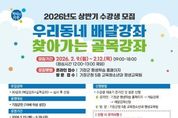 시민행정신문 강갑수 기자 | 기장군은 오는 2월 9일부터 12일까지 ‘상반기 우리동네 배달강좌 및 찾아가는 골목강좌’ 수강생을 모집한다고 6일 밝혔다. ‘우리동네 배달강좌’란 학습자가 원하는 시간과 장소에 강좌를 배달하는 평생학습 프로그램이며 ‘찾아가는 골목강좌’는 우리동네 배달강좌의 일환으로, 소외계층을 대상으로 운영되는 평생학습 프로그램이다. 이번 강좌는 ▲교육·학문 ▲어학 ▲건강 ▲음악 ▲미술·공예 ▲컴퓨터·통신 ▲가정·생활 분야 총 60강좌를 모집한다. 수업은 3월 23일부터 5월 29일까지 10주간 운영되며, 대면 수업과 함께 ZOOM 등 온라인 플랫폼을 활용한 비대면 수업을 병행해 학습 편의성과 접근성을 높일 예정이다. 신청대상은 19세 이상 기장군민으로, 대면 강좌는 10인 이상, 비대면 강좌는 7인 이상 학습자를 구성하여 강좌를 신청할 수 있다. 골목강좌는 7인 이상의 학습소외계층(▲기초생활수급자 ▲차상위계층 ▲장애인 ▲다문화·한부모·다자녀가정 ▲남성수강생 ▲직장인)으로만 구성되어야 신청이 가능하다. 신청방법은 기장군 평생학습 홈페이지에서 강사현황을 참고하여 배달강사를 선택한 후 수강