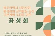 시민행정신문 강갑수 기자 | 광주광역시는 23일 오후 4시 광주광역시의회 5층 예결위회의실에서 ‘광주광역시 시민사회 활성화와 공익활동 증진을 위한 기본계획(제1차, 2026~2028)’ 최종보고회 겸 공청회를 개최한다. 광주시가 주최하고 광주시민사회지원센터가 주관하는 이번 공청회는 향후 3년간 광주 시민사회의 지속가능한 발전을 위한 정책방향을 최종 확정하기 전 시민사회 현장의 의견을 수렴하기 위해 마련됐다. 광주시는 2023년 ‘광주광역시 시민사회 활성화와 공익활동 증진 조례’를 제정하고, 2024년 7월 기존 ‘광주NGO지원센터’를 ‘광주시민사회지원센터’로 전환하며 시민사회 지원 기반을 확대했다. 올해는 전문가-행정-센터가 참여하는 ‘기본계획수립 전담팀(TF)’을 구성해 본격적인 연구에 착수했다. 전담팀(TF)은 지난 4월부터 수차례 논의와 자문을 거쳐 기본계획의 기틀을 마련했으며, 시민 및 시민사회 설문조사, 활동가 직급별 포커스그룹인터뷰(FGI) 결과를 반영해 비전과 목표, 추진전략을 구체화했다. 이번에 공개되는 기본계획은 ▲시민사회 기반과 역량 강화 ▲시민참여와 활동가 저변 확대 ▲공익활동에