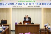 시민행정신문 강갑수 기자 | 장성군의회 의원연구단체 ‘정책개발연구회’는 지난 27일 군의회 상임위원회의실에서 ‘장성군의회 자치법규 발굴 및 정비 연구용역 최종보고회’를 개최했다. 그동안 정책개발연구회는 조례 발굴 및 정비 연구용역을 통해 장성군 지역 실정에 맞는 신규 조례 제안, 정책 변화에 맞는 조례 정비 등 자치법규를 체계적으로 연구하며 입법 실효성을 높이는 연구 활동을 활발하게 추진해 왔다. 최종보고회는 5개월간 진행한 연구용역의 최종 결과물을 공유하는 자리로 연구용역을 수행한 나라살림연구소는 최종보고회를 통해 ▲지역 실정에 맞는 신규 조례 제안 ▲주민 요구와 불편 사항을 점검한 조례 정비 제안 ▲ 유사 중복 조례의 통·폐합에 관한 사항을 중점적으로 분석한 것을 바탕으로 구체적인 제·개정 방향과 정비안 등을 제시했다. 이에 김연수 대표의원은 “이번 연구용역은 단순한 조례 발굴과 정비를 넘어 장성군 조례의 실효성을 높이고 행정의 효율화를 통해 주민 복지를 더욱 증진시키기 위해 추진하게 됐다”라고 하며 “신뢰받는 의회로 거듭나도록 연구 결과를 잘 활용해 실제 정책과 제도에 반영될 수 있도록 더욱 열정적인 의
