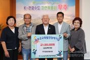시민행정신문 강갑수 기자 | 무주군은 무주읍발전협의회가 지난 29일 (재)무주군교육발전장학재단에 장학금 1백만 원을 기탁했다고 밝혔다. 김성용 회장은 “오늘 장학금은 무주읍발전협의회 회원들이 ‘제29회 무주반딧불축제 천원 국수 부스’에서 직접 일하며 얻은 수익금 중 일부로, 우리 지역 학생들을 위해 쓰자는 마음을 모아 전달하게 됐다”라며 “앞으로도 무주군 인재 양성은 물론, 지역발전과 이웃 행복을 위한 일에 관심을 가지고 지속적으로 뒷받침해 나갈 것”이라고 밝혔다. 무주읍발전협의회는 18명의 회원들이 참여하고 있는 단체로, 정월대보름 행사를 비롯해 읍민의 날 행사 주관 및 반딧불축제 지원 등 주민 화합과 무주발전을 위한 다양한 활동을 주도해 나가고 있다.