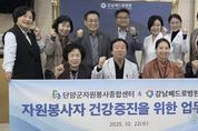 시민행정신문 강갑수 기자 | 충북 단양군자원봉사종합센터는 지난 22일 강남베드로병원과 자원봉사자의 건강복지 증진을 위한 업무협약을 체결했다고 밝혔다. 이번 협약은 단양군 자원봉사자들의 건강관리 강화를 통해 안정적인 봉사활동 환경을 조성하고, 지역사회 자원봉사 활성화를 도모하기 위해 추진됐다. 양 기관은 상호 협력체계를 구축해 의료서비스의 질을 높이고, 자원봉사자들이 보다 건강하게 봉사활동에 참여할 수 있도록 지원하기로 했다. 협약에 따라 강남베드로병원은 자원봉사자에게 건강검진, 진료, 사후관리 등 전반적인 의료서비스를 제공하고, 비급여 진료비 감면 혜택과 자원봉사자 맞춤형 종합검진 패키지도 운영할 예정이다. 단양군자원봉사센터는 대상자들의 의료 편의 제공과 홍보를 지원하며, 의료서비스 이용 접근성을 높이는 데 협조한다. 홍민우 단양군자원봉사종합센터장은 “자원봉사자의 건강은 단양군 자원봉사의 든든한 기반”이라며 “이번 협약을 통해 자원봉사자들이 전문적이고 합리적인 의료서비스를 받을 수 있게 되어 매우 뜻깊다”고 말했다. 윤민하 강남베드로병원장은 “의료서비스 접근이 어려운 지역과