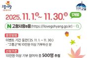 시민행정신문 강갑수 기자 | 고흥군은 유자향이 가득한 11월을 맞아 고향사랑기부제 참여자에게 감사의 마음을 전하기 위해 ‘고흥애(愛) 연말정산 이벤트’를 11월 30일까지 운영한다고 밝혔다. 이번 이벤트는 연말정산 시즌을 앞두고 기부자들의 관심이 높아지는 시기에 맞춰 마련된 것으로, 기간 내 고흥군에 10만 원 이상 기부한 참여자 중 500명을 무작위로 추첨해 다이소 모바일 상품권(1만 원권)을 증정한다. 군은 이번 행사를 통해 연말정산 시 세액공제 혜택(10만 원 전액, 초과분 16.5%)을 다시 한번 알리고, 고흥의 대표 농수특산물 답례품을 함께 홍보할 계획이다. 답례품으로는 ▲2025년산 햅쌀 ▲향기로운 유자 제품 ▲김 ▲고흥 한우 ▲나로도 삼치회 등 청정 고흥을 대표하는 품목이 인기를 끌고 있다. 특히 11월에는 고흥유자축제(11.6.~9.)와 연계한 현장 홍보를 강화해 향우와 관광객을 대상으로 기부 참여를 독려할 예정이다. 군 행정과 관계자는 “고흥의 유자향처럼 따뜻한 마음이 전국으로 퍼져나가길 바란다”며 “기부금은 아동·청소년 복지, 문화·의료 인프라 확충 등 군민의 삶의 질