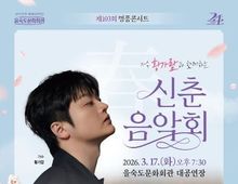 시민행정신문 기자 | 사하구 을숙도문화회관은 오는 3월 17일 오후 7시 30분 대공연장에서 제103회 명품콘서트 '가수 황가람과 함께하는 신춘음악회'를 개최해 봄의 시작을 알릴 예정이다. 이번 공연은 따뜻한 음색과 진정성 있는 감성으로 사랑받는 가수 황가람과 홀톤심포니오케스트라가 함께하는 무대로, 겨우내 지친 구민들의 마음을 위로하고 새로운 봄의 시작을 음악으로 축하하는 신춘음악회로 기획했다. 공연은 클래식과 대중음악을 아우르는 구성으로 1부에서는 오케스트라 연주와 함께 테너·소프라노 성악 협연을 통해 클래식 명곡을 선보이고, 2부에서는 황가람의 대표곡을 오케스트라 협연으로 만나 볼 수 있다. 여기에 드럼과 모듬북 협연이 더해진 역동적인 무대를 통해 봄날의 생동감을 한층 끌어올릴 예정이다. 이번 신춘음악회는 실력 있는 연주자들의 탄탄한 라인업을 바탕으로 예술성과 대중성이 조화된 무대를 선사하며, 남녀노소 누구나 공감할 수 있는 음악으로 관객들에게 특별한 문화 향유의 시간을 제공할 것으로 기대된다. 예매는 을숙도문화회관 홈페이지를 통해 가능하며 1층 3만 원, 2층 2만 원으로 사전 예매 시 20% 할인 혜택