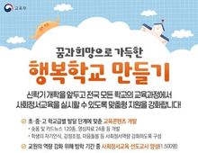 시민행정신문 장규호 기자 | ◆ 꿈과 희망으로 가득한 행복학교 만들기 신학기 개학을 앞두고 전국 모든 학교의 교육과정에서 사회정서교육을 실시할 수 있도록 맞춤형 지원을 강화합니다! - 초·중·고 학교급별 발달 단계에 맞춘 교육 콘텐츠 개발 · 숏폼 및 카드뉴스 120종, 영상자료 24종 등 개발 · 학생의 자기인식, 감정조절, 마음돌봄 등 사회정서역량 강화하도록 구성 - 교원의 역량 강화 위해 방학 기간 중 사회정서교육 선도교사 양성(1500명) - 교사와 학부모가 교육자료를 쉽게 활용할 수 있도록 에듀넷 내 사회정서교육 전용서비스 1월 29일 개통