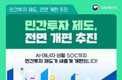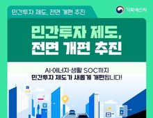 시민행정신문 장규호 기자 | AI·에너지·생활 SOC까지 민간투자 제도가 새롭게 개편됩니다! 1. 민간투자 제도란? 사회 기반 시설에 대한 민간의 투자를 촉진하여 창의적·효율적으로 사회기반시설을 확충·운영하는 제도 제도 도입 이후 30년 동안 총 872개 사업, 약 154조 원 규모의 민자사업 추진 → AI 등 신산업 분야, 노후시설 성능 개선 등 급증하는 투자 수요에 대응하기 위해서는 재정과 민간투자의 병행이 필수! 2. 이렇게 달라집니다. - 신사업·신유형 확대 - 국민 참여 확대 및 국민 생활 편익 증진 - 지방의 민자 활성화 및 민자사업의 안전 강화 - 절차 단축 등 사업 추진 여건 개선 4대 분야 20개 과제 마련으로 '민간투자의 패러다임 전환' 3. ① 신사업·신유형 확대 AI 데이터센터, 전력망, 철도 복합 시설 등 신산업·신유형 분야에 민간투자 활용 전통적 SOC(도로·철도 등)에서 벗어나 신산업 분야에도 민자 방식을 도입하고, 단순 운영형 민자 신설, 대상지 공모 방식 개선 등으로 신유형 사업 방식을 활성화합니다. ② 국민 참여 확대 및 편익 증진 일반 국민