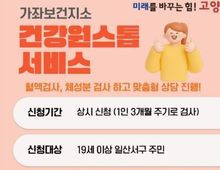 시민행정신문 기자 | 세종특별자치시보건소가 9일부터 개인별 건강수준을 파악하고 맞춤형 서비스를 제공하는 건강 누리실을 북부권으로 확대 운영한다. 해당 서비스는 동지역 만성질환 고위험군 주민을 대상으로 고운건강생활지원센터에서 제공됐으나 북부권 주민에게도 맞춤형 건강관리 서비스를 제공하고자 대상 범위를 확대했다. 이용자는 건강매니저와 간호사, 영양사 등으로 구성된 전문인력의 기초설문과 건강검사 결과를 바탕으로 건강증진 계획을 수립할 수 있다. 또한, 이와 연계된 맞춤형 상담과 통합 건강서비스, 만성질환 예방 및 사후 관리 등을 받을 수 있다. 사업 대상은 읍면동 지역에 거주하면서 혈압과 혈당, 고지혈증 등 만성질환을 앓고 있는 19세 이상 세종시민이다. 건강검사는 혈압·혈당, 콜레스테롤, 체성분 검사 등으로, 혈액 검사 시 최소 8시간 공복 상태에서 받아야 한다. 신청은 9일부터 시 보건소 누리집를 통해 사전 예약 후 이용 가능하다. 자세한 사항은 시 보건소 건강 누리실로 문의하면 된다. 정재훈 소장은 “건강 누리실을 통해 시민들이 건강을 보다 효과적