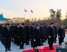 시민행정신문 이존영 기자 | 이재명 대통령은 2026년 병오년 새해 첫날, 국립서울현충원 참배로 공식 일정을 시작했다. 참배식에는 김민석 국무총리 및 국무위원·장관들과, 강훈식 대통령비서실장을 비롯한 청와대 참모진이 함께했다. 먼저 이 대통령은 현충탑에 헌화·분향한 뒤 묵념하며 순국선열과 호국영령의 넋을 기렸다. 이어 방명록에 '“함께 사는 세상” 대한민국 대도약의 원년 대한국민과 함께 열겠습니다'라고 서명하면서 병오년 새해 의지를 담았다. 참배 이후 이 대통령은 청와대 직원식당에서 현충원 참배 참석자들과 떡국으로 조찬을 하며 덕담을 나눴다. 국립서울현충원 참배(이재명tv 유투브)