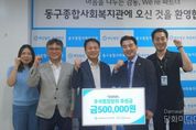 시민행정신문 강갑수 기자 | 부산 동구, 동구종합사회복지관은 근로복지공단 부산지역본부에서 10월 1일 추석 명절을 앞두고, 동구 지역 소외계층에게 힘이 될 수 있도록 50만 원의 후원금을 동구종합사회복지관에 전달했다고 밝혔다. 해당 성금은 동구 지역 내 취약계층의 추석 명절맞이 지원으로 활용될 예정이다. 이외에도 근로복지공단 부산지역본부에서는 임직원들이 매주 수요일마다 복지관 4층 장난감도서관을 방문해 어린아이들이 안전하게 놀 수 있도록 장난감 소독 봉사활동에 꾸준히 참여하고 있다. 민병창 근로복지공단 부산지역본부장은 “어른, 아이 할 것 없이 모두가 행복하고 즐거운 동구가 될 수 있도록 앞으로도 다양한 활동을 통해 사회공헌사업을 이어나가겠다” 고 밝혔다.