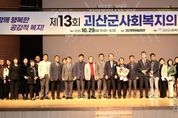 시민행정신문 강갑수 기자 | 충북 괴산군은 29일 괴산군 문화예술회관에서 ‘제13회 괴산군 사회복지의 날 기념행사’를 개최했다고 밝혔다. 이번 행사는 괴산군사회복지협의회(회장 고명성) 주관으로 열렸으며, 송인헌 괴산군수를 비롯한 사회복지시설 종사자 등 200여 명이 참석한 가운데 사회복지인의 노고를 격려하고 화합을 다지는 자리로 마련됐다. 행사는 장연지역아동센터 합창단의 식전공연을 시작으로, 괴산군사회복지협의회 회장 이·취임식, 유공자 표창, 인사말, 퍼포먼스 순으로 진행됐다. 이날 이·취임식에서는 최은묵 전 회장에 이어 고명성 신임 회장이 취임했으며, 유공자 표창 수여식에서는 지역 사회복지 증진에 기여한 12명이 표창을 받았다. △군수 표창은 배기만(괴산지역자활센터), 이정자(성제노의집), 심서경(괴산재가복지센터), 이충정(괴산군노인복지관), 안미경(청천재활원), 천병주(수달지역아동센터), 이봉우(햇살재가복지센터), 이정민(괴산군 가족행복과) 등 8명이 수상했다. △군의장 표창은 신미경(괴산지역자활센터), 이만형(청천재활원) 등 2명, △괴산군사회복지협의회장 표창은 조경옥(청주사랑나눔