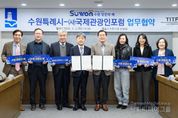 시민행정신문 강갑수 기자 | 수원특례시와 (사)국제관광인포럼(TITF)이 ‘글로벌 관광도시 수원’을 만들어 가기 위해 협력한다. 수원시와 (사)국제관광인포럼은 2일 시청 상황실에서 업무협약을 체결하고, ‘제5회 세계관광산업콘퍼런스 개최(6월 5일~6일)’와 ‘2026~2027 수원 방문의 해’의 성공적인 추진을 위해 협력하기로 했다. 협약식에는 이재준 수원특례시장과 국제관광인포럼 김정배 회장, 신연성 부회장, 금기형 사무총장, 신중목 후원회장, 연정아 이사 등이 참석했다. 양 기관은 협약에 따라 ‘제5회 세계관광산업콘퍼런스 공동 개최·운영’, ‘수원시 관광자원 홍보·국제 관광시장 확대 등을 협력하기로 했다. 수원시는 이번 협약을 계기로 국제 관광 네트워크를 확대하고, 수원의 관광자원과 도시 경쟁력을 세계에 알려 ‘1500만 관광객 시대’를 열 계획이다. (사)국제관광인포럼은 2013년 문화체육관광부 인가를 받아 설립된 관광 분야 전문 단체다. 국내·외 관광 전문인 간 교류 협력을 바탕으로 세계 관광산업 발전과 지속가능관광 육성을 지원하고 있다. 김정배 국제관광인포럼 회장은