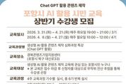 시민행정신문 강갑수 기자 | 포항시는 디지털 전환 시대에 대응해 시민의 정보 활용 역량을 높이기 위해 시민정보화교육과 생성형 AI 활용 특강을 연계 운영하며 시민 대상 교육을 본격 추진하고 있다. 시민정보화교육은 종합운동장 2층에서 3월부터 11월까지 운영되며, 회차당 75명 정원으로 진행된다. 높은 참여율을 보이며 시민들의 관심 속에 1회차 교육이 운영 중이다. 이번 1회차 교육은 컴퓨터 및 인터넷 기초, 엑셀 2021, 스마트폰 활용 등 실생활 중심 과정으로 구성돼 시민들의 디지털 기초 역량 향상에 초점을 맞추고 있다. 2회차 교육은 오는 24일부터 26일까지 접수를 진행한 뒤 3월 30일부터 4월 17일까지 운영될 예정이며 컴퓨터활용능력(2급 실기), ITQ 엑셀, 한글 2022 과정이 개설된다. 교육 신청은 방문·전화 또는 포항시 홈페이지를 통해 가능하며, 교육생은 전산 추첨 방식으로 선발된다. 포항시는 정보화교육과 연계해 생성형 AI 활용 콘텐츠 제작 특강도 함께 운영하고 있다. 특강은 경북콘텐츠기업지원센터에서 진행되며, ChatGPT를 활용한 글쓰기와 콘텐츠 제작 실습 중심으