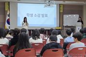 시민행정신문 기자 | 충청북도교육청 직속기관 국제교육원 부설 영재교육원은 11월 3일과 4일, 충주와 청주에서 각각 영어영재교육 수료식을 열고, 2025학년도 교육과정을 성공적으로 마무리했다. 초등학교 5학년부터 중학교 2학년 영어영재교육 참여 학생 68명(충주 36명, 청주 32명)을 비롯해 보호자와 담당 교사가 참석해, 한 해 동안의 성과를 함께 나누는 시간을 가졌다. 교육활동 동영상 시청을 시작으로, 학생들의 수료 소감 발표, 수료증 수여 등의 순서로 진행됐으며, 학생 발표 시간에는 큰 호응이 이어졌다. 탄금중학교 1학년 이하율 학생은 “매주 원어민 선생님들과 영어로 학습할 수 있어 유익하고 즐거운 시간이었어요. 벌써 종강이라 아쉽고, 내년에도 꼭 참여하고 싶어요.”라며 소감을 전했다. 올해 영어영재교육은 ▲원어민 교사와 함께하는 영어 수업 ▲리더십‧진로‧세계시민교육 특강 ▲유네스코 아시아태평양 국제이해교육원, 국립외교원 방문 등 현장 체험 학습 ▲충북 청소년 국제포럼 등 다양한 경험을 할 수 있는 과정으로 운영됐다. 참가 학생들은 환경, 사회와 법, 문학, 뉴스와 대중매체, 인