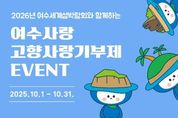 시민행정신문 강갑수 기자 | 여수시는 10월 한 달간 10만 원 이상 고향사랑기부에 참여한 기부자 선착순 300명에게 ‘2026여수세계섬박람회’ 입장권을 증정하는 특별 이벤트를 진행하고 있다고 밝혔다. 이번 이벤트는 고향사랑기부제 참여자에게 감사의 뜻을 전하고 오는 2026년 개최되는 2026여수세계섬박람회를 널리 알리기 위해 마련됐다. ‘고향사랑기부제’는 자신의 주소지가 아닌 지자체에 연간 2,000만 원 이내 금액을 기부하면 세액공제(10만 원 이하 전액, 초과분 16.5%)와 함께 기부 금액의 30% 이내 답례품을 받을 수 있는 제도다. 이번 이벤트에 참여한 기부자 선착순 300명에게는 이러한 기본 혜택 외에도 섬박람회 입장권(성인권 1매)이 추가로 제공된다. 입장권은 이벤트 종료 후 순차적으로 발송될 예정이다. 참여 방법은 고향사랑e음 누리집에서 10만 원 이상 기부 후 포스터 하단 QR코드를 통해 신청서를 작성·제출하면 된다. 시 관계자는 “고향사랑기부제는 기부금 세액공제와 답례품 제공 등 다양한 혜택을 누릴 수 있는 1석 3조의 제도인데 이번 이벤트로 여수에 기부