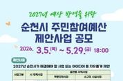 시민행정신문 강갑수 기자 | 순천시는 2027년도 예산편성 과정에 시민의 다양한 의견과 아이디어를 반영하기 위해 3월부터 5월까지 주민참여예산 제안사업을 접수한다고 밝혔다. 주민참여예산제는 시민이 직접 지역에 필요한 사업을 제안하고, 이를 예산에 반영함으로써 재정 운영의 투명성과 민주성을 높이는 제도이다. 시민의 시각에서 생활 속 불편사항을 발굴하고, 지역 현안 해결을 위한 정책을 제안할 수 있다는 점에서 실질적인 참여 행정의 대표제도로 자리매김하고 있다. 순천시는 2021년부터 24개 읍면동 주민자치회를 전면 시행해 왔으며, 주민참여예산제를 통해 생활밀착형 사업과 지역 현안 사업을 지속적으로 발굴·추진해 왔다. 그 결과 소규모 생활환경 개선, 지역특화사업, 지역돌봄 및 역량강화 사업 등 시민 체감도가 높은 사업들이 다수 반영됐다. 이번 공모는 순천시에 주소를 두거나 생활권을 두고 있는 시민 누구나 참여 가능하며, ▲생활 불편해소 ▲지역 공동체 활성화 ▲돌봄․안전·환경 개선 등 시민의 일상과 밀접한 다양한 분야의 사업을 자유롭게 제안할 수 있다. 접수된 사업은 관련 부서의