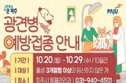 시민행정신문 강갑수 기자 | 파주시는 반려견을 동반한 야외활동이 잦아지는 가을을 맞아 오는 20일부터 29일까지 생후 3개월 이상의 임신하지 않은 개를 대상으로 광견병 예방접종을 실시한다고 밝혔다. 광견병은 바이러스에 의해 사람과 동물 모두에게 감염될 수 있는 인수공통전염병으로, 잠복기가 상당히 길고 증세가 나타날 경우 치사율이 매우 높기 때문에 사람과 반려동물 모두를 위해 반려견은 매년 1회 반드시 예방접종할 것을 적극 권장하고 있다. 시는 하반기 광견병 예방사업을 위해 예방백신 4,500마리 분을 무상 지원하며, 예방접종을 희망하는 반려견 보호자는 33개 지정 동물병원을 방문해 시술비 1만 원만 부담하면 접종이 가능하다. 참여 동물병원 목록은 파주시청 누리집 공고문을 통해 확인할 수 있다. 동물병원이 없는 읍면지역은 시에서 직접 수의사를 파견해 순회접종을 진행하며, 이 경우 접종비 전액을 시에서 지원할 방침이다. 읍면지역 순회접종 일정은 해당 읍면 행정복지센터 산업팀에 문의하면 된다. 아울러 파주시는 야생동물의 광견병 전파를 막기 위해 광견병 미끼백신을 너구리 등 야생동물이 자주 출몰하는 관내