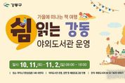 시민행정신문 강갑수 기자 | 강동구는 10월 11일부터 11월 2일까지 한 달간 파믹스가든(상일동 145-6)에서 주말 야외 도서관 '쉼 읽는 강동'을 운영한다고 밝혔다. ‘가을에 떠나는 책 여행’이라는 주제로 열리는 이번 행사에는 행사 기간 매주 토요일 ‘기억 쉼’, ‘일상 쉼’, ‘웰니스 쉼’, ‘함께 쉼’을 테마로 프로그램을 운영한다. 10월 11일(기억 쉼) 프로그램으로는 거북선 만들기 등의 체험과 ‘최강보 아티스트’의 비눗방울 마술공연이 진행된다. 특히, 이날 오전 10시에는 ‘큰별쌤’ 최태성 강사의 특강이 함께 진행되어 행사의 첫날을 빛낼 예정이다. 10월 18일(일상 쉼)에는 손수건 만들기 등의 체험과 그림책 독서와 원예 활동을 접목한 ‘그림책 가드닝’ 등의 프로그램이 운영된다. 10월 25일(웰니스 쉼)에는 자연을 탐구하는 프로그램이 진행된다. 꽃·나뭇잎 등으로 책갈피를 만드는 체험은 물론, 숲 해설가와 함께하는 자연 관찰 프로그램인 ‘그림책 숲 해설’이 진행된다. 11월 1일(함께 쉼)에는 샌드위치 만들기 프로그램을 비롯해 참여자가 직접 중고책을 플리마켓을 운영하는 참여형 프로그램들이 진행된다.