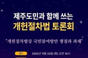 시민행정신문 기자 | 제주특별자치도의회, 제주특별자치도 주민자치위원회협의회, 제주대학교 리걸클리닉센터, 제주미래디자인포럼, 사회적협동조합 제주로 공동 주최로 11월 25일 오전 10시, 제주특별자치도의회 1층 대회의실에서 '제주도민과 함께 쓰는 개헌절차법 토론회'를 개최한다. 국민주권 시대에 국민이 주도하는 헌법 개정 요구가 커지고 있고 이에 시민의회 방안, 국민청원 방안, 추진협의회 방안 등 국민참여방안을 담은 개헌절차법안이 3건이 국회에 발의됐지만 3건 법안의 국민참여방안은 제주도민의 의견을 충분히 반영하기에는 미흡하다는 지적이 있음에따라 이번 토론회는 제주도민의 목소리가 실질적으로 담길 수 있는 개헌절차법 제정 방안을 깊이 있게 모색하기 위해 마련됐다. 토론회는 이상봉 제주특별자치도의회 의장의 인사말로 시작하여 이남근 제주특별자치도의회 의원이 좌장을 맡고 신용인 제주대학교 로스쿨 교수가 '개헌절차법상 국민참여 방안 쟁점과 과제'를 주제로 발표할 예정이다. 또한 고정학 제주특별자치도주민자치위원회협의회장, 신훈민 변호사, 양광수 아라동 주민자치위원장, 조현주 국민주도상생개헌행동 상임공동대표가 제주도민의 목소