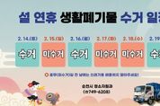 시민행정신문 강갑수 기자 | 순천시는 설 연휴 기간 생활폐기물로 인한 시민 불편을 최소화하고 쾌적한 도시환경을 조성하기 위해 생활폐기물 수집·운반체계를 안정적으로 운영한다고 밝혔다. 설 연휴 기간 종량제 및 재활용, 음식물쓰레기 등 생활폐기물은 14일과 16일에 정상적으로 수거된다. 다만, 설날 당일인 17일 화요일과 18일 수요일은 수거하지 않는다. 수거하지 않는 전날은 배출 자제를 당부했다. 이에 따라 시는 미수거일인 17일과 18일, 생활폐기물 수집·운반 대행업체와 합동으로 기동처리반을 운영해 쓰레기 적체와 관련 민원에 신속히 대응할 방침이다. 한편, 설 연휴를 앞두고 오는 12일, 시 공직자와 환경미화원, 24개 읍면동의 이·통장, 주민자치회, 자원봉사자 등 시민들이 참여하는 설 맞이 합동 대청소를 실시한다. 이번 대청소는 여순로, 매천로 등 4대 관문과 공한지, 이면도로 등 청소 취약지역을 중심으로 진행된다. 시 관계자는 “설 연휴 기간 시민 불편을 최소화하기 위해 생활폐기물 처리에 만전을 기하겠다”며 “생활폐기물은 반드시 수거일 전날 일몰 후에 배출해