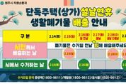 시민행정신문 강갑수 기자 | 원주시는 설 연휴 동안 생활폐기물로 인한 시민 불편을 최소화하고 쾌적한 명절 분위기를 조성하기 위해 ‘설 연휴 생활폐기물 관리 대책’을 선제적으로 추진한다. 연휴 기간인 2월 14일부터 18일까지는 ‘생활폐기물 대책 상황반’과 청소 대행업체 19개 반, 53명으로 구성된 ‘기동처리반’이 가동된다. 이들은 무실동 롯데시네마, 단계동 장미공원길, 중앙시장 등 폐기물 적체가 예상되는 주요 거점을 순찰하고 관련 민원을 신속히 처리할 계획이다. 일요일인 2월 15일과 설 당일인 17일, 설 다음 날인 18일은 수거하지 않으므로, 단독주택과 상가 지역은 2월 15일과 18일 일몰 후에 배출하면 된다. 장성미 자원순환과장은 “연휴 기간 생활폐기물 수거 일정을 참고하셔서 깨끗한 원주시를 함께 만들어 주시길 바란다”라고 말했다.