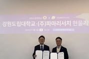 시민행정신문 강갑수 기자 | 강원도립대학교와 재생의학 기반 바이오 제약 기업인 ㈜파마리서치(대표이사 손지훈)가 지역 혁신 성장을 주도할 전문 인재 양성을 위해 손을 잡았다. 강원도립대학교는 2월 4일 대학 본부에서 파마리서치와 ‘산학협력 업무협약 및 현물 기탁식’을 개최했다고 밝혔다. 이번 행사는 양 기관이 앞서 서면으로 체결한 산학협력 협약의 내용을 공유하고, 파마리서치 측에서 기탁한 현물을 전달하기 위해 마련됐다. 양 기관은 이번 협약을 통해 대학과 기업이 보유한 역량을 결합해 지역 맞춤형 인재 양성을 위한 현장 밀착형 교육 생태계를 구축하기로 뜻을 모았으며, 영동지역 청년 인재 채용 활성화 및 실무형 전문 인력 양성, 객관적 취업 정보 공유, 산학 공동발전을 위한 구체적인 협력 사업을 함께 펼칠 예정이다. 특히 파마리서치는 이번 MOU 체결을 기념해 학생과 교직원에게 1천만원 상당의 자사 대표 제품을 기탁하며 학생들의 건강한 도전과 성장을 응원했다. 강원도립대학교 최종균 총장은 “글로벌 바이오 기업인 파마리서치의 소중한 기탁과 협력 약속에 깊은 감사를 드린다”며 “대학 또한 기업