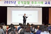 시민행정신문 강갑수 기자 | 진주시는 3일 시청 2층 시민홀에서 공무원 250여 명이 참석한 가운데 ‘2025년 공직감찰 주요사례 교육'을 실시했다. 이번 교육은 최근 공직사회에 대한 시민들의 기대와 관심이 높아지는 가운데, 공직자의 청렴 의식을 높이고 각종 비위 행위를 사전에 예방해 투명하고 공정한 직무 수행 역량을 강화하기 위해 마련됐다. 교육은 경상남도 감사위원회 류승업 공직감찰담당을 강사로 초빙하여 진행됐다. 도내에서 실제 발생한 공직감찰 사례를 중심으로, 공직자가 유의해야 할 청렴 기준과 행동 원칙을 소개하며 실질적이고 현장감 있는 내용으로 구성됐다. 특히 추상적인 원칙이나 법률 설명보다 구체적이고 실제적인 사례를 통해 참석자들이 비위 유형별 예방법을 현장에서 즉시 적용할 수 있도록 함으로써, 조직 전반에 청렴문화가 정착될 수 있는 기반을 마련하고 공직자로서의 책임감과 윤리의식을 강화하는 계기가 됐다. 전현수 감사관은 "공직사회에 대한 시민들의 기대와 관심이 높아지고 있는 가운데, 실제 사례를 통한 교육으로 공직자들의 청렴 의식을 한층 더 강화하겠다”며 "깨끗하고 공정한 행정