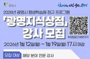 시민행정신문 강갑수 기자 | 광명시 평생학습원이 시민 맞춤형 평생학습 프로그램 ‘광명지식상점’을 운영할 2026년도 전문 교육 강사를 공개 모집한다. ‘광명지식상점’은 시민의 삶과 밀접한 주제를 중심으로 배움과 성장을 지원하는 광명시 대표 평생학습 프로그램이다. 2026년에는 ▲미래기술 ▲직무역량 ▲재무설계 ▲인문성찰 ▲관계학습 ▲시민학습 ▲기타 제안과정 등 7개 분야에서 강사를 선발해 시민들에게 다채로운 교육 서비스를 제공할 예정이다. 지원 자격은 해당 모집 분야의 전문성을 보유하고 관련 자격증과 실무경력을 모두 갖춘 자에 한한다. 시는 강의 경력, 강의계획서, 자기소개서 등을 바탕으로 1차 서류심사를 진행한 뒤, 수업 시연과 질의응답으로 구성된 2차 면접심사를 거쳐 최종 40여 명의 강사를 선발할 계획이다. 접수는 오는 12일부터 19일 17시까지 이메일 또는 평생학습원 2층 사무실 방문을 통해 가능하다. 제출 서류 등 세부 사항은 광명시 평생학습플랫폼 ‘광명이(e)지’ 공지사항에서 확인할 수 있다. 최종 합격자는 2월 중 ‘광명e지’에서 발표하며, 선발된 강사진은 3월부터 본격적으