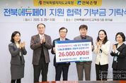 시민행정신문 강갑수 기자 | 전북에듀페이카드 운영사인 전북은행이 전북특별자치도교육청에 장학금 2,600만 원을 기부했다. 전북교육청과 전북은행은 25일 본청 5층 회의실에서 전북에듀페이 지원 협력사업 기부금 기탁식을 개최했다. 전북은행은 이날 전북에듀페이카드 바우처 사용액의 0.1%에 해당하는 2,600만 원의 기부금을 학생 복지와 지역사회 공헌의 취지로 기탁했다. 지난해 2,000만 원을 기부한 전북은행은 내년까지 3년 동안 약 6,300만 원을 기부할 계획이다. 전북은행 기부금은 전북특별자치도교육청사랑의장학회를 통해 장학금으로 전달된다. 올해 초중고 학생과 학교 밖 청소년 등 총 16만3,000여 명에게 238억여 원의 전북에듀페이를 지원하기로 한 전북교육청은 이달 24일부터 다음 달 15일까지 집중신청 기간을 운영하고 있다. 김은호 전북은행 부행장은 “전북에듀페이카드 운영사로서 전북에듀페이를 매개로 나눔과 베풂의 학생 교육복지에 동참할 수 있어 뜻깊게 생각한다”고 밝혔다. 한긍수 정책국장은 “전북에듀페이가 단순한 지원금을 넘어 교육과 나눔이 공존하는 선순