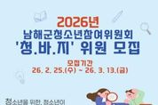 시민행정신문 강갑수 기자 | 남해군은 2026년 지역 청소년 정책을 함께 만들어 갈 청소년참여위원회 신규 위원을 모집한다고 밝혔다. 청소년참여위원회 ‘청바지’(청소년을 위한 청소년이 바라는 청소년들에 의한 지역사회)는 청소년 관련 정책과 사업을 제안하고, 사업 추진 과정에 주체적으로 참여하는 청소년 참여 기구다. 청소년의 권익 증진과 실질적인 정책 반영을 위해 운영 되며, 학교 생활, 진로, 문화활동, 복지, 안전 등 청소년의 삶과 밀접한 다양한 분야를 다룬다. 위원으로 선발되면 정기회의와 분과활동에 참여하여, 정책 제안서 작성, 간담회 참석, 지역 행사 및 캠페인 활동 등을 수행하게 된다. 특히 청소년의 시각에서 지역 현안을 바라보고 개선방안을 제시하는 과정은 참여 청소년들에게 뜻깊은 경험이 될 것으로 기대된다. 모집 대상은 지역 내 거주하거나 재학 중인 청소년으로, 평소 지역사회의 정책 활동에 관심이 있거나 다양한 경험을 희망하는 청소년이면 누구나 지원이 가능하며, 총 20명을 선발할 예정이다. 청소년은 공개모집과 학교와 기관 추천을 병행해 선발하며, 활동기간은 4월부터