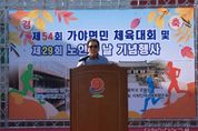 시민행정신문 강갑수 기자 | 합천군 가야면은 26일 해인중학교 운동장에서 제54회 가야면민체육대회 및 제29회 노인의 날 기념행사를 개최했다. 가야면 체육회(회장 임재후)가 주최하고 대한노인회 가야면분회(회장 김상원)가 주관한 이번 행사는 기념식과 체육행사, 문화공연 순으로 진행됐으며, 김윤철 합천군수와 신성범 국회의원, 장진영 경상남도의회의원, 신명기, 조삼술 합천군의회의원 등을 비롯한 지역 어르신 800여명이 참석했다. 이날 기념식에서는 그간 우리 지역의 노인복지 증진과 지역발전을 위해 헌신해 온 한판명 사촌1구 경로당 회장 외 10명에 대한 표창 및 감사패와 지역의 체육발전에 공헌한 학생에 대한 장학금이 수여됐다. 임재후 가야면 체육회장은“본 행사를 위해 바쁘신 중에도 참석하여 자리를 빛내주신귀빈 여러분들께 감사드리며, 이 행사를 준비해주신 여러 관계자분들에게도 감사드린다. 본 행사를 통해 가야면의 건강과 화합을 다지고, 어르신들도 건강하고 의미있는 시간이 되시기를 바란다”며 축사를 전했다.