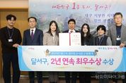 시민행정신문 강갑수 기자 | 대구 달서구는 행정안전부가 전국 243개 지방자치단체를 대상으로 실시한 ‘2025년 세외수입 운영·실적 분석 진단 평가’에서 최우수기관으로 선정돼, 세외수입 분야에서 전국 유일의 6년 연속 우수기관이라는 성과를 거뒀다. 행정안전부는 지방자치단체의 지방세외수입 징수 실적과 관리·운영 시책을 종합적으로 진단하기 위해 2015년부터 매년 세외수입 운영실적 평가를 실시하고 있다. 이번 평가는 전국 지방자치단체를 인구 규모와 재정 여건에 따라 14개 그룹으로 유형화한 뒤, 징수율 등 정량평가(100점)와 우수사례 및 특별회계 관리 등 가점(4점)을 합산해 우수기관을 선정했다. 그 결과 달서구는 인구 및 재정 규모가 가장 큰 그룹에서 2020년부터 2025년까지 6년 연속(최우수 4회·우수 2회) 우수기관으로 선정되는 성과를 거뒀다. 달서구는 이번 평가에서 높은 세외수입 징수율은 물론, ▲ 고액 체납자 책임 징수제 운영 ▲ 세외수입 징수대책 보고회 정례화 ▲ 압류대장 및 멸실 인정 차량 일제 정비를 통한 대체압류 ▲ 과태료 체납 차량 번호판 집중 영치의 날 운영 등 체계적이고 실효