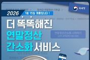 시민행정신문 장규호 기자 | 더 똑똑해진 연말정산 간소화 서비스 2026년 1월 15일 개통합니다! ■ 더~욱 새로워진 연말정산 간소화 서비스 기존 42개 자료+ 3개 자료 추가 1. 발달 재활 서비스 이용 증명 2. 장애인 활동 지원 급여 본인 부담금 자료 3. 체육시설 이용료 자료 ■ 더~욱 정교해진 소득 기준 초과 부양가족 명단 제공 소득 금액 100만 원 초과 부양가족에 대한 정보 연말정산 간소화 서비스 자료 조회 화면에서 안내 * 근로소득만 있는 경우 총급여 500만 원 - 소득 기준 초과 부양가족 내역 * 자세한 사항은 국세청 블로그를 참고해주세요! ■ AI 전화 챗봇 상담 - 국세 상담센터: ☎126→0번→0번(상담사 또는 AI 상담사 연결) - 세무서: 대표번호→2번→6번(AI 상담사 연결) (AI 상담사) · 주민등록번호 입력 후 본인인증 연말정산 간소화 자료 일괄 제공 현황, 부양가족의 간소화 자료 제공 동의 현황 등 · 생성형 AI 챗봇 상담 시범 운영 경로→홈택스 접속→홈택스 퀵메뉴→챗봇 상담 클릭 *홈택스 ■ 연말정산 유