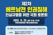 시민행정신문 이준석 기자 | 민형배 의원(더불어민주당, 광주 광산을)이 마련한 '제2차 베트남전 인권침해 진실규명을 위한 국회 토론회'가 내일(25일) 오전 9시 30분부터 국회의원회관 제5간담회의실에서 개최된다. 이번 토론회는 베트남전 파병군인 인권침해에 대한 진실규명 문제를 논하는 최초의 공개 토론회이다. 지난 9월 30일 민형배 의원은 '베트남전쟁 시기 대한민국 국군에 의한 민간인 및 파병군인 등에 대한 인권침해 사건 진실규명특별법안'(민형배 의원 등 30명 공동발의, 이하 베트남전 진실규명법)을 발의했다. 이 법안은 한국군에 의한 집단학살 등 인권침해 사건뿐만 아니라 파병군인의 자살·전쟁 후유증 등을 조사 범위에 포함하도록 한다. 법안 발의에 이어 개최되는 이번 토론회에서는 베트남전 파병군인이 겪은 군 내부 폭력·자살·전쟁 후유증 등의 인권침해를 중심으로 논의한다. 양현아 서울대 법학전문대학원 명예교수가 사회를 맡고, 하미학살 피해생존자 응우옌티탄이 영상 발언을 통해 베트남전 진실규명법 제정을 국회와 시민사회에 호소한다. 노용석 교수(국립부경대학교)가 “베트남전 파병과 민주주의, 그리고 파병군인의